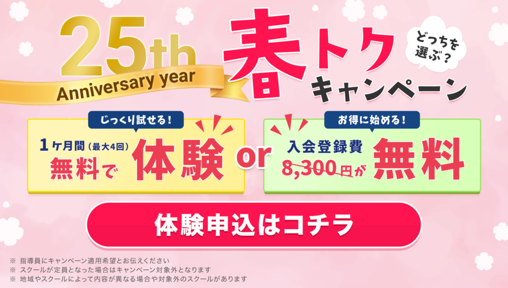 担当の指導員へ「春トクキャンペーン利用」とお伝えいただき、ご希望の特典をお選びいただけます。